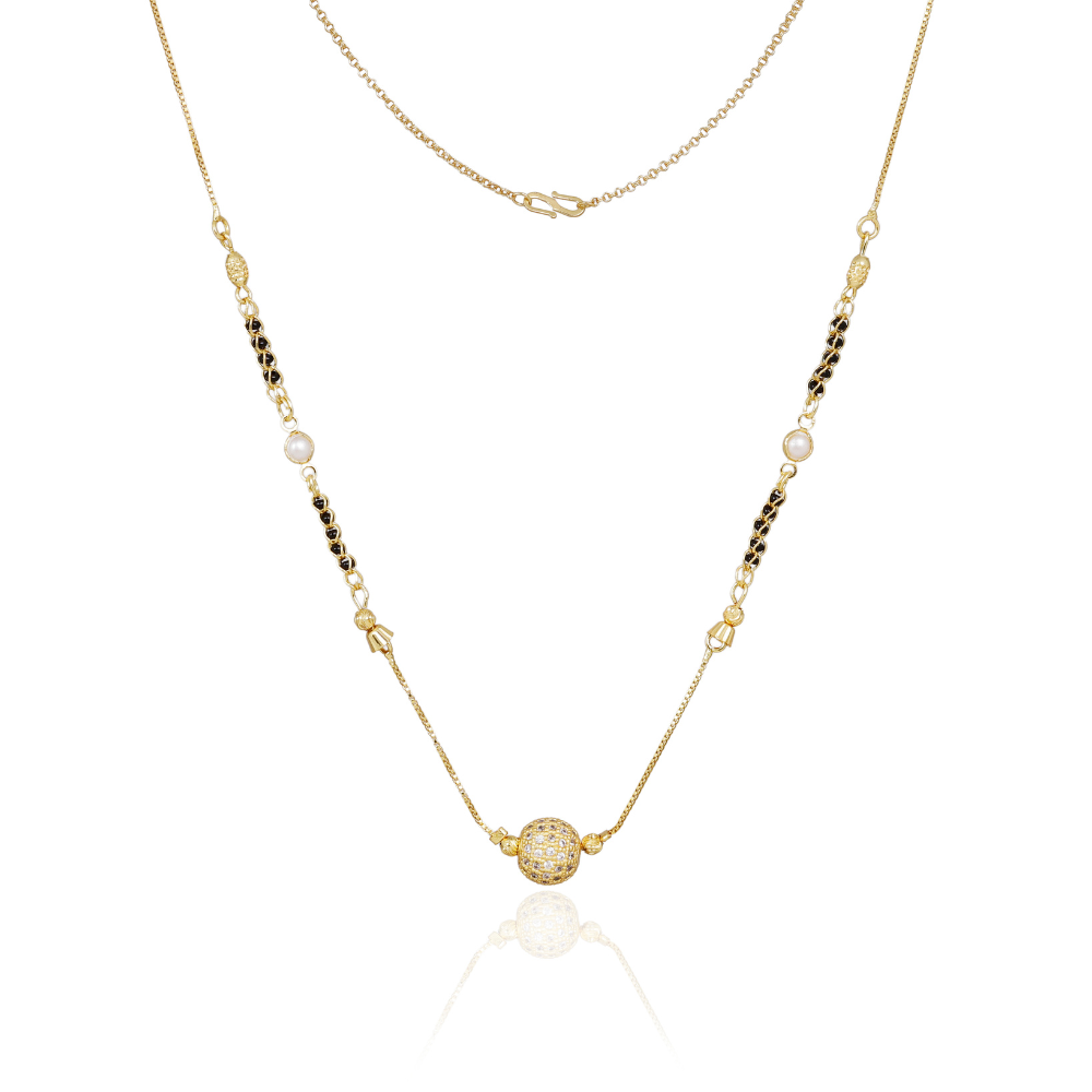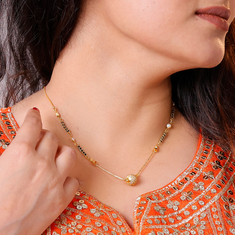 Modern sophistication meets traditional charm with the Sparkling Pearl Cube Mangalsutra. Designed with a radiant cube-shaped pendant and elegant pearl accents, this piece adds a refined glow to your everyday style. Its sleek black-bead detailing pairs beautifully with the gold-tone finish for a look that’s effortlessly graceful.