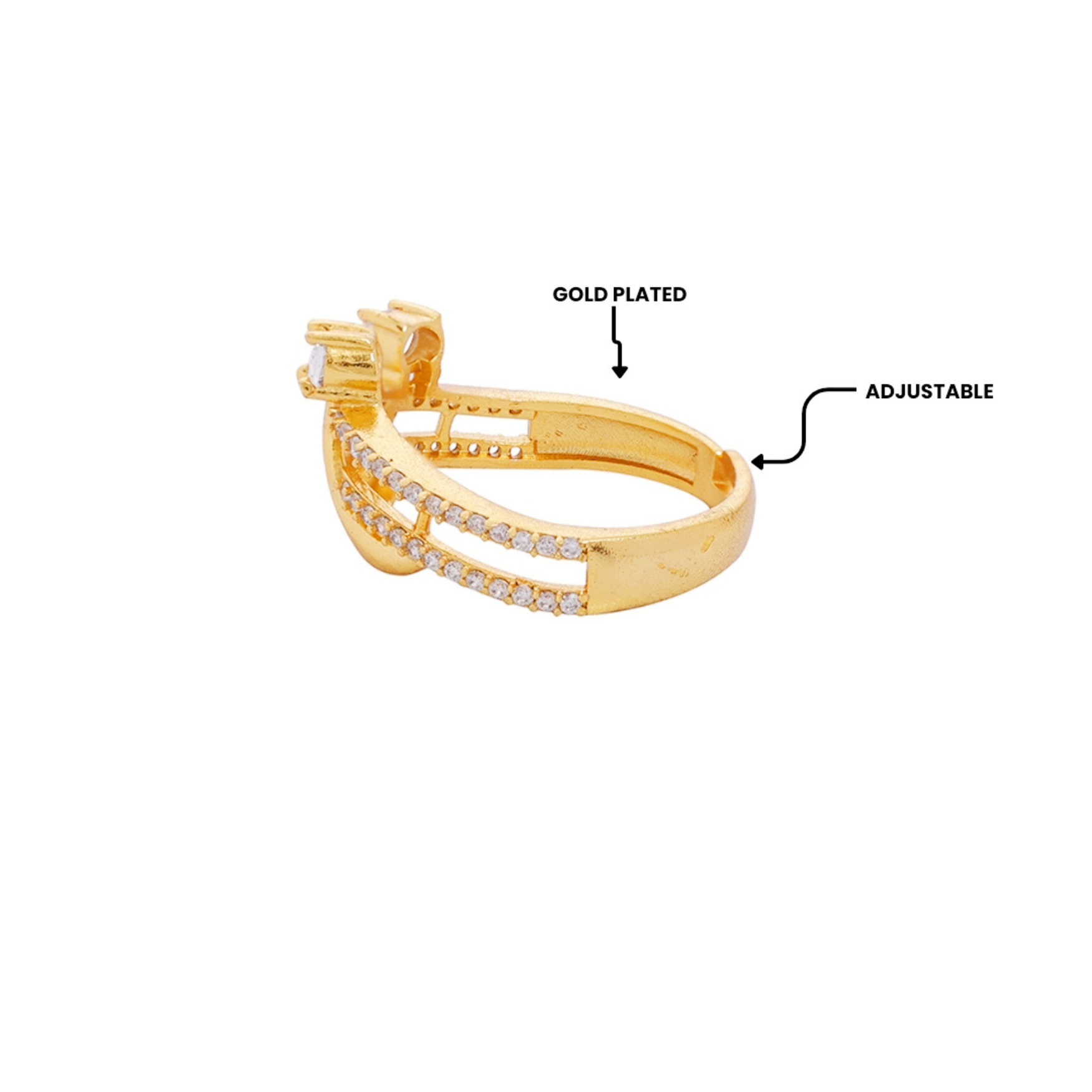 Modern elegance with a bold twist — the Twin Lumière Statement Ring features two radiant solitaire stones set atop layered pavé bands. Crafted in a rich gold-plated finish, this design brings depth, sparkle, and a striking contemporary appeal.